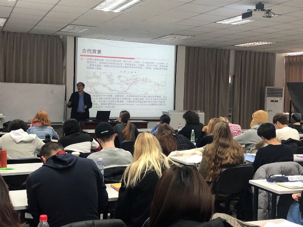 2019年12月18日,海外教育学院党支部书记、院长高伟在学院六楼为学生讲授了“一带一路”的教学专题。