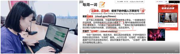 于婧老师的“中国报刊阅读”,结合当前疫情,介绍疫情下的中国万事皆可“云”。担心疫情传播,健身房开设网课或者微信健身课程,教练们根据每个人指定训练计划和时间表,录制视频,人们居家云健身,还有如云泡吧、云课堂等等,让留学生看到疫情下中国人的乐观和积极的生活态度。