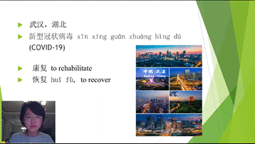 杨恬老师的“初级综合汉语-3”开课之始,即结合授课内容,在屏幕展示中国武汉的图文,告诉学生这就是武汉,而这座美丽的城市正在顽强地抗击病毒的侵害,以此引起大家的关注和共鸣,同时也让学生更加理解了我们网上授课的意义。