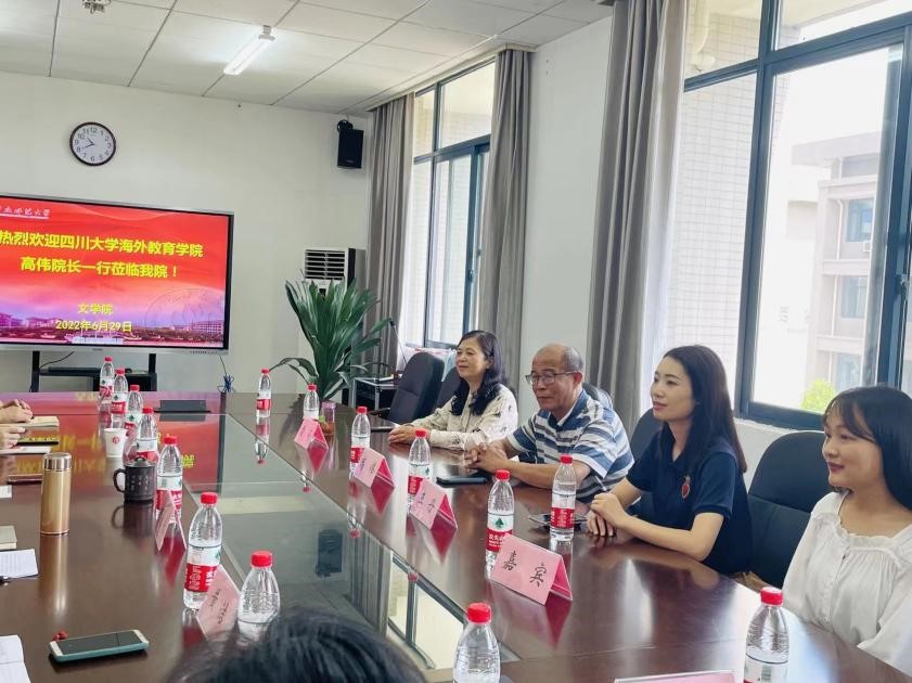 张院长首先介绍了国际汉语文化学院的发展建设、教育教学环境设施、项目开展工作等情况。在随后的座谈中,双方就各自学院的基本情况进行介绍,并商议了关于成渝双城经济圈孔子学院联盟的相关工作事宜,并就下一届成渝地区国际中文教师教学技能大赛的举行进行了商讨。