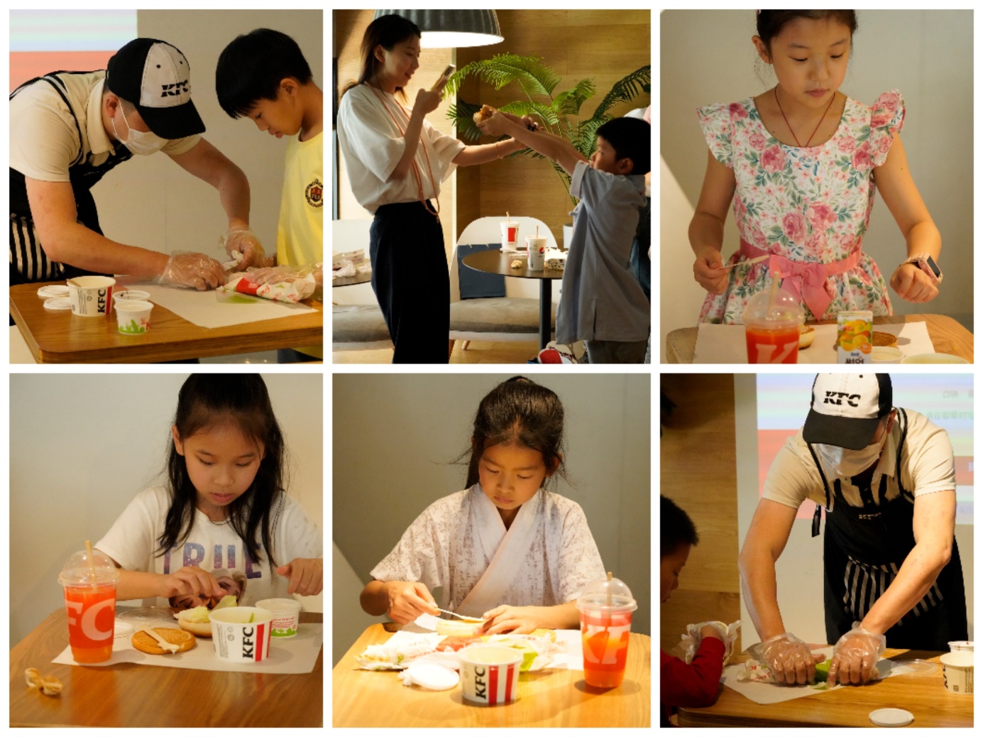 中午前往肯德基,小朋友在老师带领下亲手制作鸡肉卷、汉堡并与父母分享,让人感动满满。