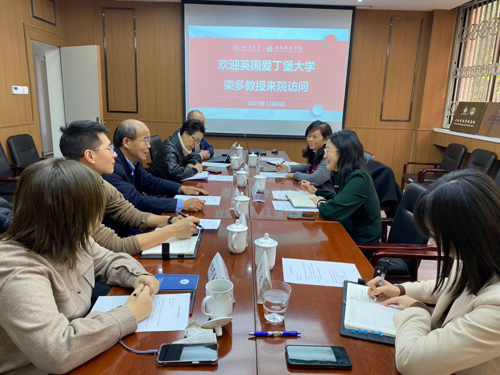 2023年12月6日,英国爱丁堡大学东亚系系主任、爱丁堡大学孔子学院外方院长栾多教授来海外教育学院访问。海外教育学院院长高伟、副院长雷莉,学院各科室科长及学校留学生管理办公室招生科科长参加会议。双方就海外教育学院与爱丁堡大学东亚系“2+1+1”学生项目等相关问题展开了热烈的会谈与交流。会议由海外教育学院副院长雷莉主持。