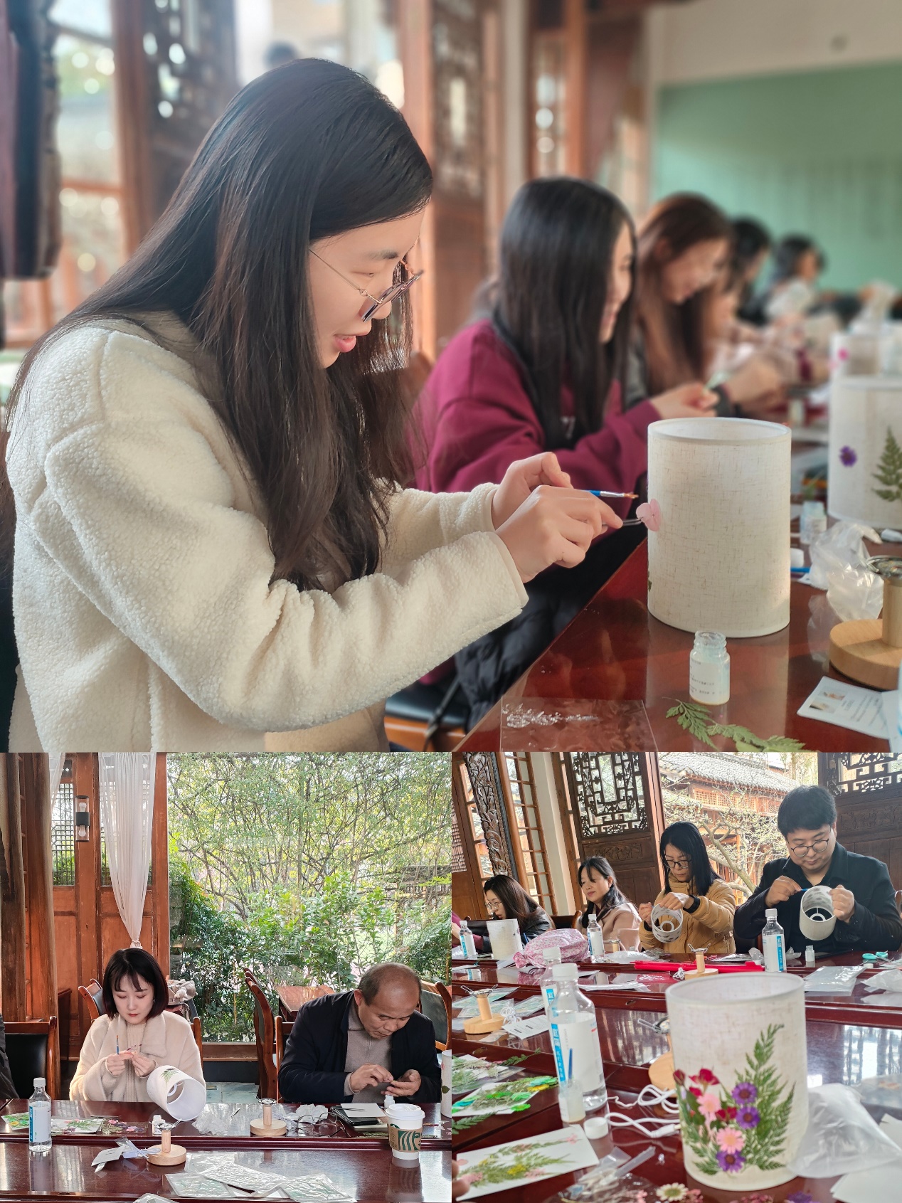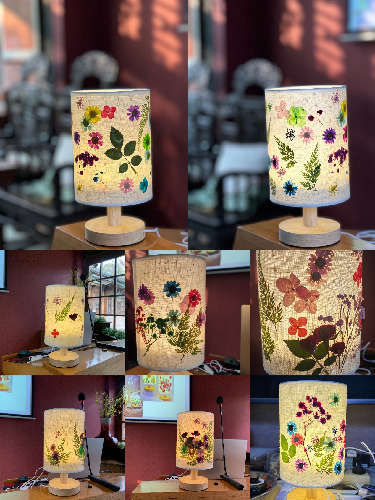 压花台灯有着极强的自主性,为参加的教师们提供了足够的发挥和操作空间。老师们充分发挥自己的创造力和想象力,用不同种类与颜色的干花材料,呈现出不同的搭配组合,创造出精彩纷呈、风格各异的压花台灯作品。