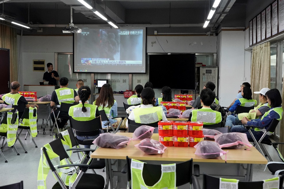 演练开始前,首先组织大家进行消防安全培训为主题的理论学习。了解了如何正确判断身边的火灾隐患,明晰了如何正确开展火灾逃生自救的方法。认真学习了干粉灭火器、灭火毯及过滤式自救呼吸器的正确使用方法。