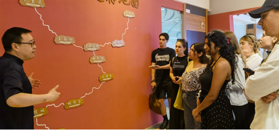 交流活动上,三国梦想家主理人陈凯老师于入口处向留学生们介绍了“三国梦想·家”名称来历及该项目内涵和特色,由此开启了三国文化参观之旅。留学生们首先观赏了“镇店之宝”——“赤壁之战”大型壁画,了解了画中所描绘的历史故事,同时感受到其中所蕴含的传统美学思想及先进环保理念。在微型三国主题博物馆,陈凯老师对展示区域的各部分内容及特点进行了详细介绍,尤其是关公主题系列油画以及与武侯祠博物馆联合展出的诸葛亮前后《出师表》等书法作品,使得留学生们深度领略了三国文化的魅力。