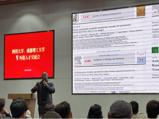 交流会上,best365英国在线体育和成都理工大学的代表各自分享了他们在成都的经历。成都理工大学的Ukwuoma Chiagoziem Chima老师以“合作”为主题,讲述了他在电子科技大学攻读博士学位以及在成都理工大学任教的经历,以其生动的叙述与积极的互动,鼓励在座学生加强交流、深化合作。