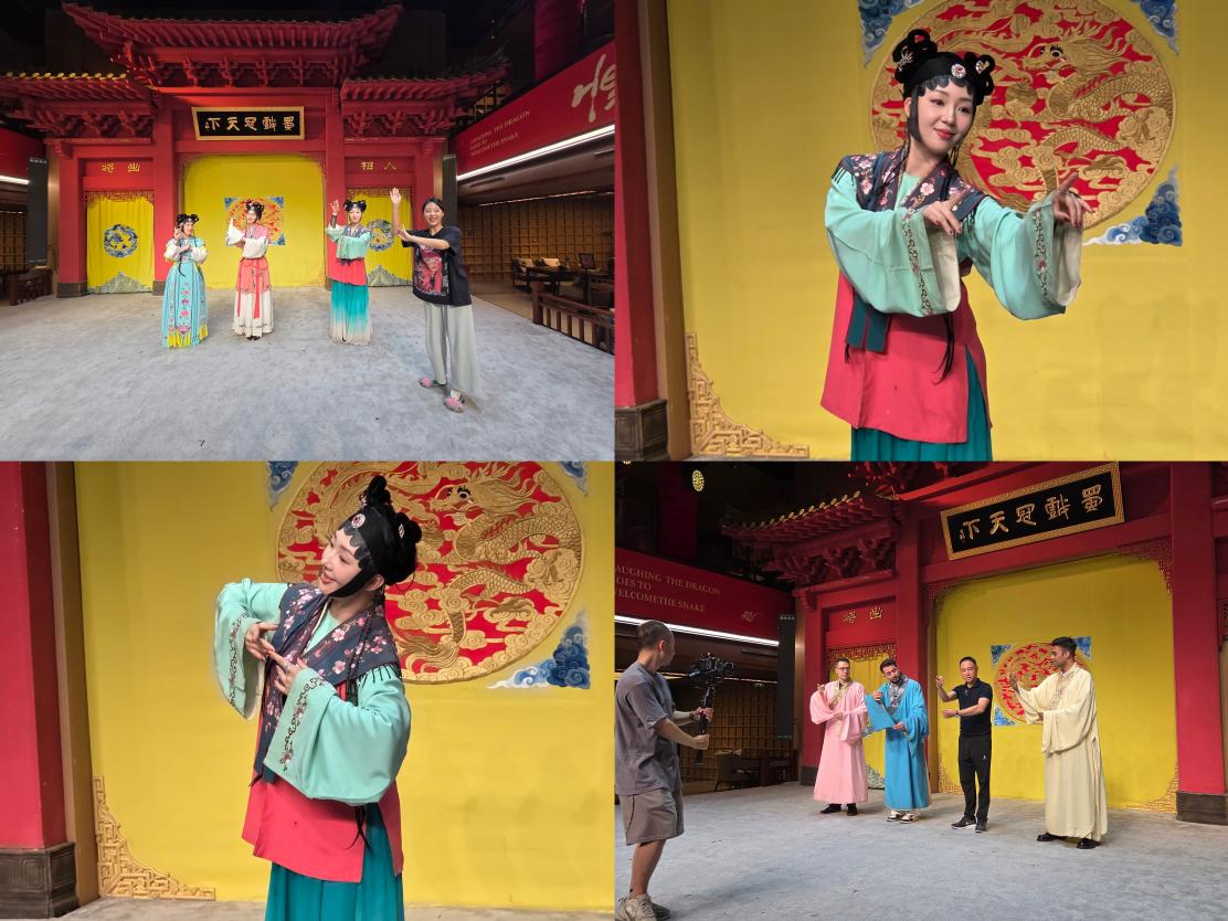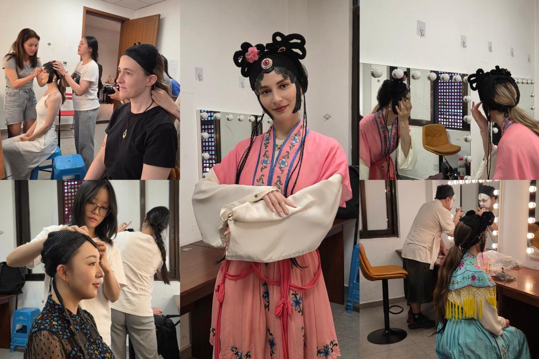 理论讲解与实践教学点燃了大家的兴趣,随后的换装环节更添期待。在成都川剧研究院服装师的协助下,留学生们换上了精美的川剧戏服。褪去日常装扮,身着戏服、略施粉黛的他们,仿佛瞬间融入了戏曲时空。随后,教学分组展开:熊剑导演专注于指导三位男生的基础身段,优秀青年演员田甜则带领三位女生学习旦角姿态。从眼神流转到手势拿捏,从步伐移动到身姿韵律,两位老师耐心示范,学生们认真模仿。这些看似简单的动作初体验,让留学生们真切感受到了川剧动作的讲究与独特美感。带着新奇与一丝紧张,他们在悦来茶园的舞台上尝试重现方才学到的身段。华美的戏服与特别的妆容,不仅是一次形象转换,更是一次深刻的文化角色代入,拉近了他们与这门古老艺术的距离。