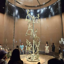 比利时鲁汶大学卡米尔(Camille)同学从技术史角度展开观察,她赞叹道:“青铜神树与青铜面具的体量堪称恢宏,其规模远非寻常馆藏文物可比。尤其巨型面具的突目设计,极具视觉冲击力,令人过目难忘。”