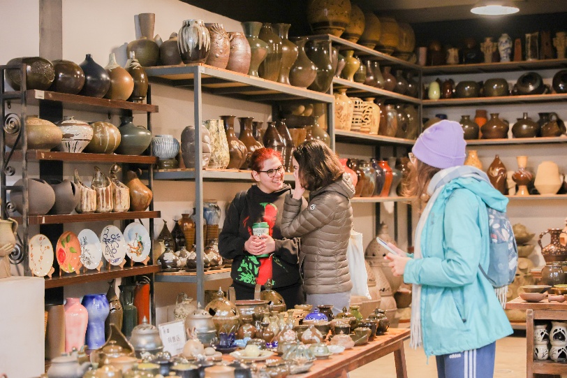 随后,师生们来到手工制作实验室,室内陈列的陶艺作品精巧别致,从质朴的茶具到抽象的雕塑,每一件都体现了手工艺人的匠心。在创意设计实验室,留学生们被一摞摞创意作品所吸引,并在引导下纷纷盖章留印,以传统方式纪念此次文化之旅。