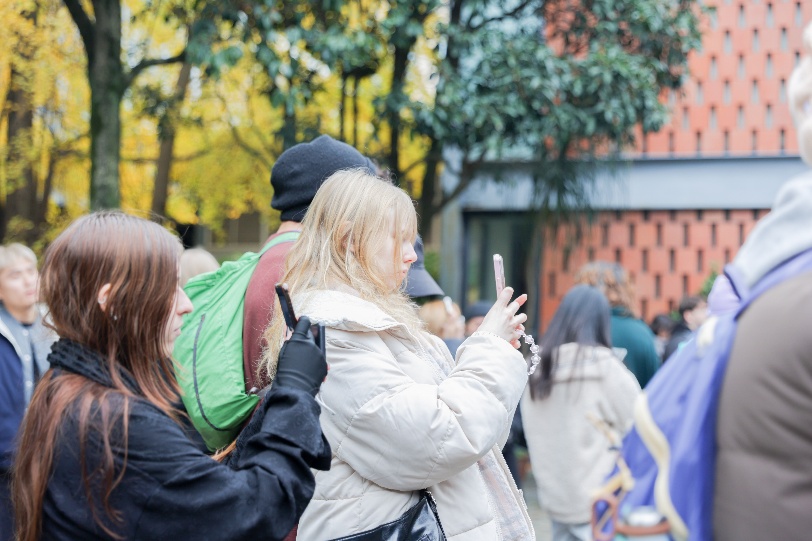 随后,队伍移步至中国女红博物馆,馆内陈列的川西民族服饰、各类传统布艺作品以及精美的蜀绣,瞬间将学生们带入一个静谧而绚烂的工艺世界。讲解老师解释道,这些精美的刺绣、扎染作品承载着深厚的地域文化,是民间技艺的活态传承。留学生们仔细观察着服饰的纹样与工艺,在实物观摩中学习相关中文词汇,直观感受到中国女红艺术的细腻与多彩。沿着学院小径前行,队伍路经一面红艳艳的火棘果墙,簇簇火红的果实与灰白的墙面形成鲜明对比,留学生们纷纷驻足拍照,将自然生机与校园景致定格在镜头中。