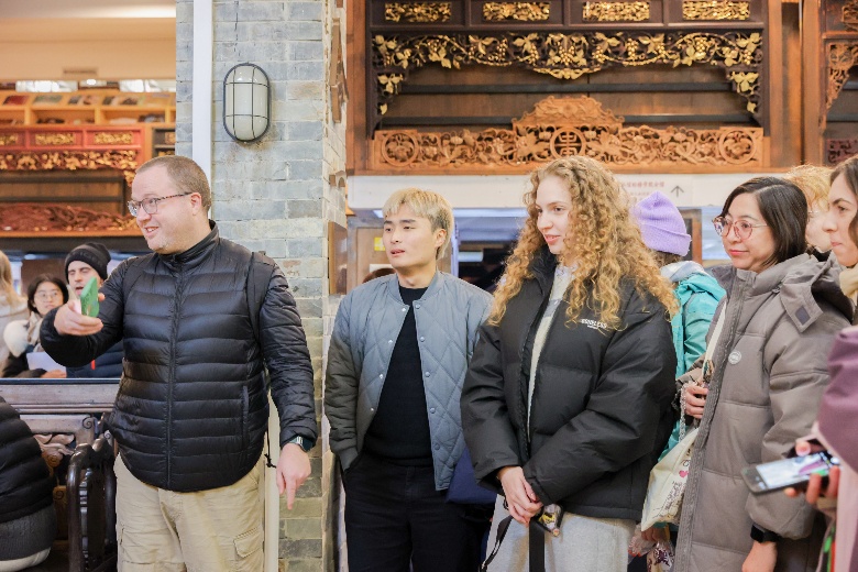 活动伊始,留学生们便被学院独特的校园景观所吸引,他们首先参观了学校的标志性建筑——图书馆。图书馆作为学院的知识殿堂,其现代设计与丰富藏书相得益彰。更令人印象深刻的是,馆内部分书桌和书架由当地村民捐赠的回收木材制成,这一细节让留学生们对“可持续发展”的中国理念有了直观的认识。
