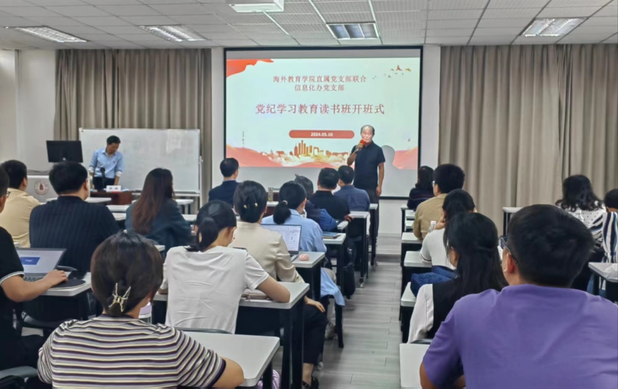 5月10日下午,海外教育学院直属党支部与信息化办党支部在海外教育学院六楼多功能厅联合举行党纪学习教育读书班开班式。