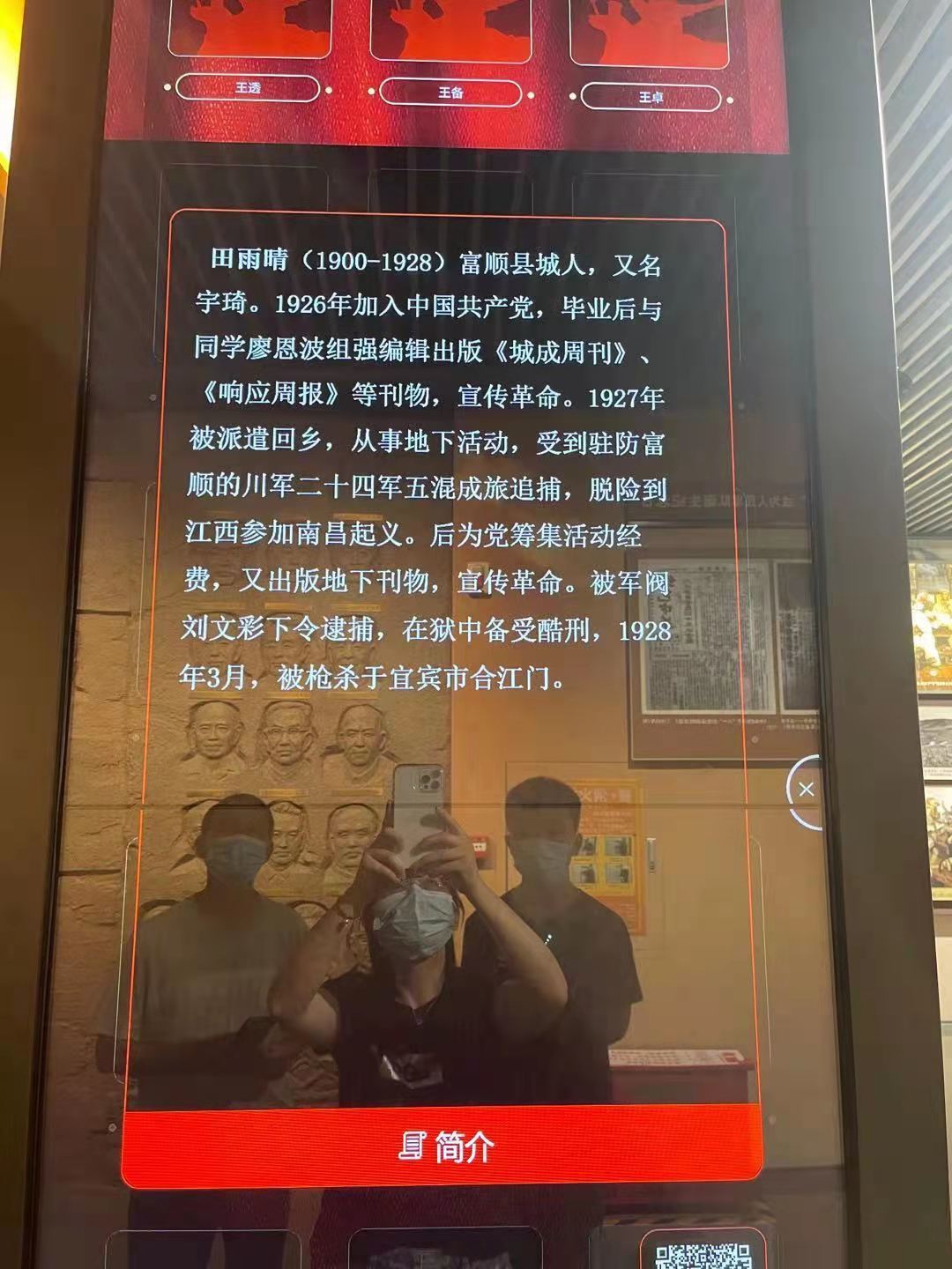 南昌八一起义纪念馆的电子展示屏上关于田雨晴一段简介。